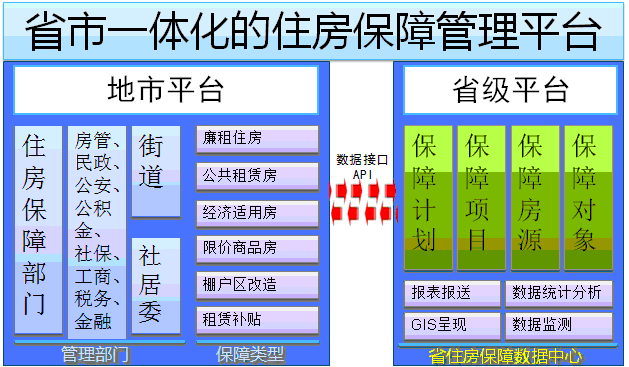 建立省市一体化的住房保障平台,省级平台关注宏观、数据、正常、监督、分析和决策;市级平台关注业务、审核流程、分配/入住及后续管理。
